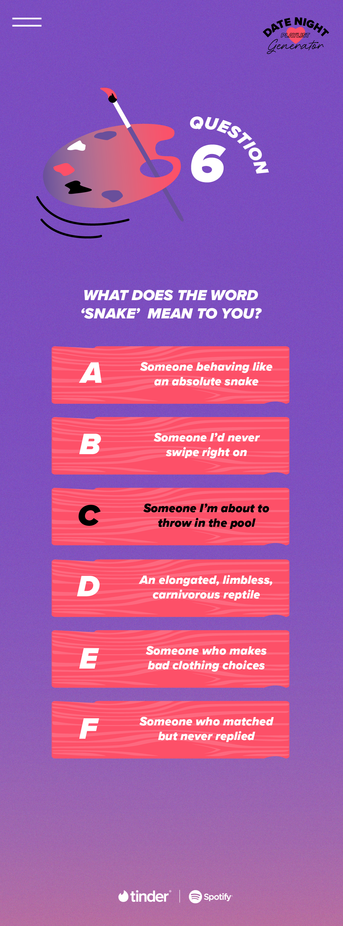 An in-app quiz that curated personalised date night playlists for Tinder users via Spotify.